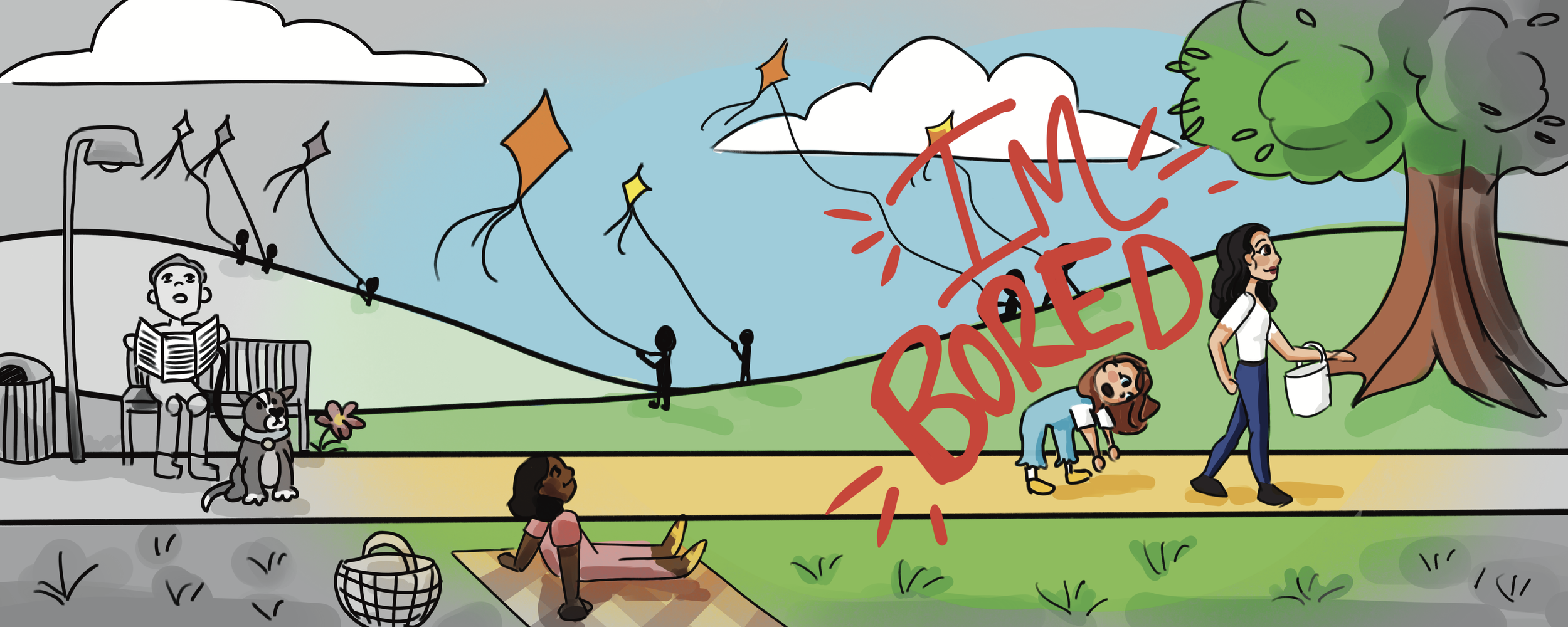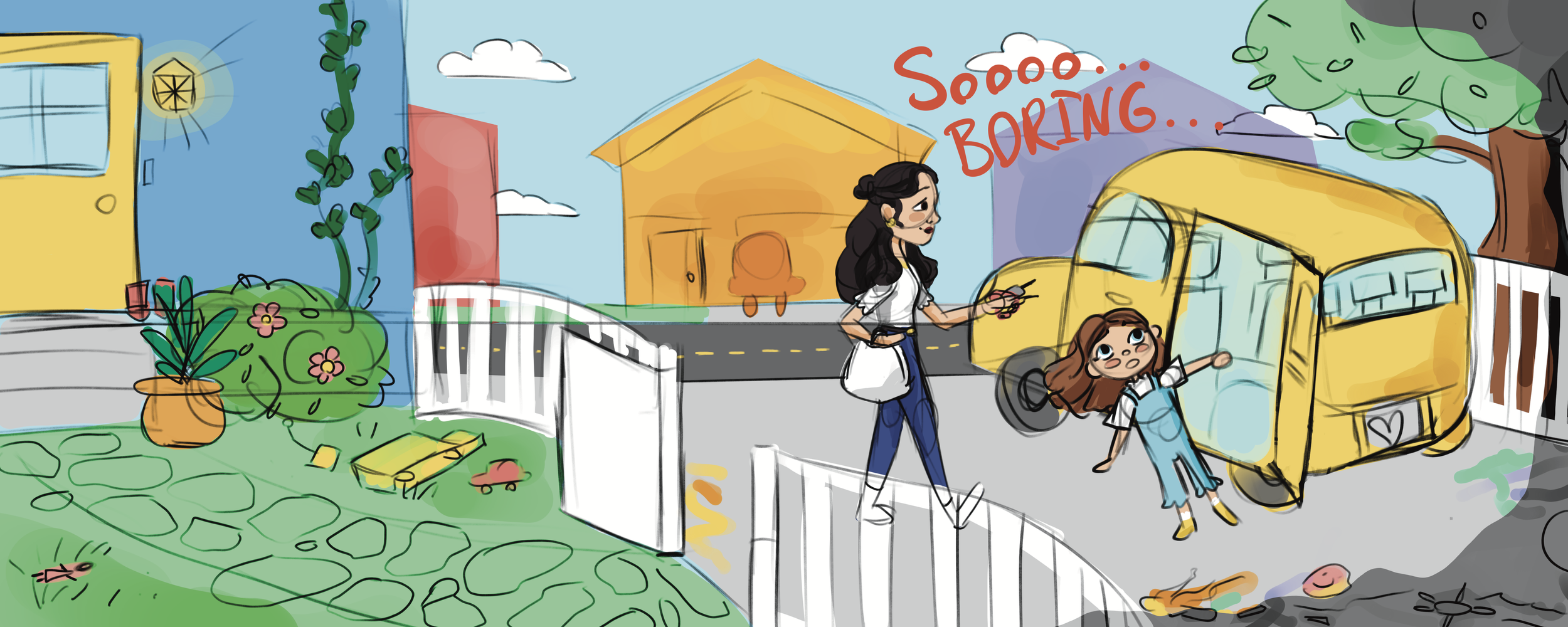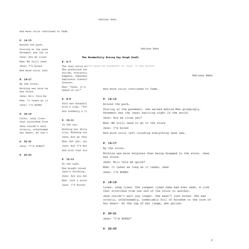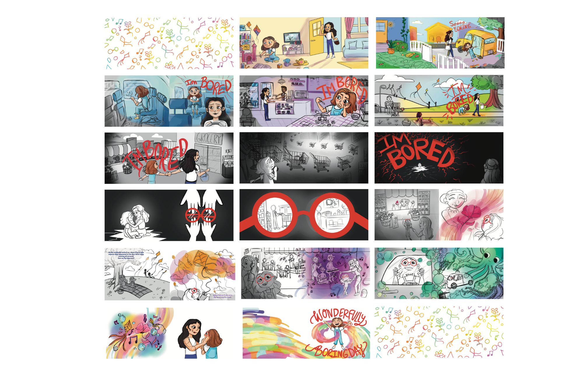 The real world is utterly, completely, and astonishingly boring! Six-year-old me would wholeheartedly agree with this statement. How could the real world compete with the magical worlds you create as a child? Adult me, on the other hand, can hardly comprehend that sentiment. I never get bored, but many of my adult friends still experience this negative emotion. What changed between now and then? My mom. I would not see the world with a lens of beauty without my mother, whose curious love of learning opened my eyes to the real world's magical moments. Boredom is the tool to unlock curiosity, and curiosity is the key to unlock wonder. Contrary to my six-year-old self, there is extraordinary in the ordinary. We often just need to learn to change our perspectives. My goal with this story is to explore the power of this perspective shift by providing a tool to understand boredom in a new light through the writing and illustration of this children's book, using visual transformation, whimsical imagery, and relatable characters to speak to children and parents.