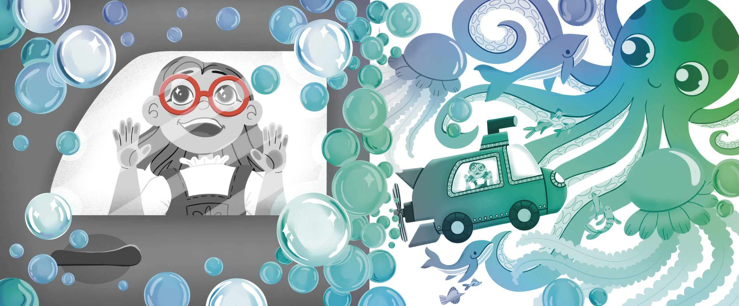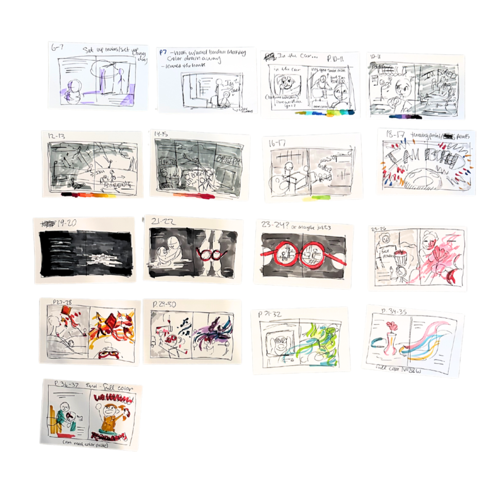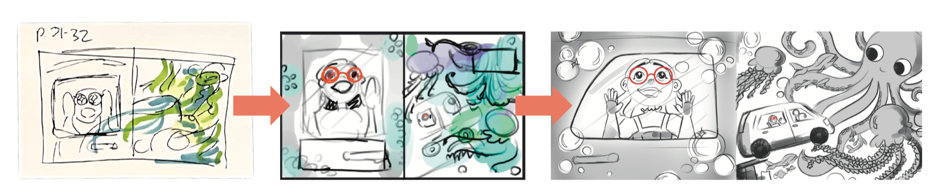 After many hours, I end up with a fully conceptualized children's book dummy, including a manuscript and all illustrated page story beats. This gives me a guideline for how to create consistently in the rendering phase, where I digitally finish each image.
